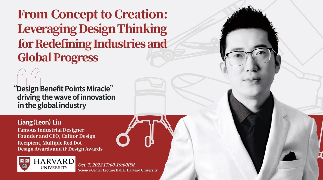 On October 7, 2023, 5:00-7:00 PM (EST), the Internationally renowned industrial designer, Founder and CEO of Califor Design, winner of multiple Red Dot Design Awards and IF Design Awards, Liang (Leon) Liu, as a special guest speaker, Liang gave a wonderful speech on "Design Benefit Points Miracle”: Driving the Wave of Innovation in the Global Industry" in Lecture Hall E, Science Center, Harvard University.