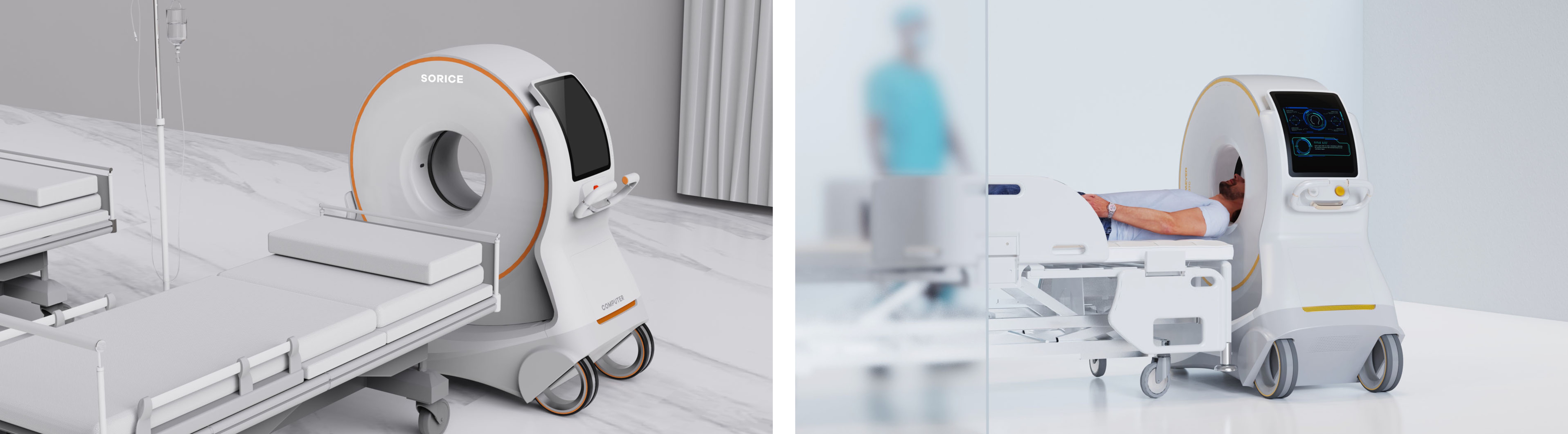 This device features a triangular design formed by its main body and wheels, creating a visually appealing and highly designed appearance. The hollowed-out tires showcase a sense of technology. The side is equipped with a flexible screen, which better aligns with users' daily operations, enhancing the overall user experience.The mobile head CT is a movable CT imaging system designed for bedside imaging. It is primarily used for X-ray imaging of the patient's head and limbs, meeting clinical needs and adapting to different working environments. It can be applied in various departments such as emergency medicine, neurosurgery, otolaryngology, providing support for the shift of medical imaging examinations and reducing the risk of patient transfer during transportation to the imaging department. This helps minimize the potential secondary harm to critically ill patients that may occur during traditional imaging examinations.
